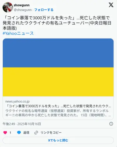 著名ビットコイン投資家のガリチ氏、急落で46億円失い愛車のランボルギーニ車内で自殺