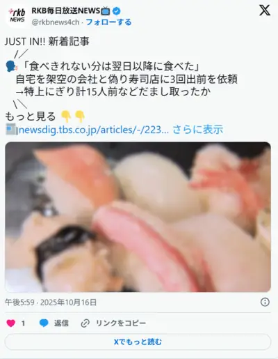 無職46歳が企業を装い特上寿司5人前を注文、食べきれず翌日も食べる→3回繰り返したらバレた
