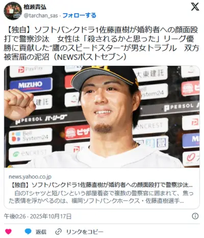【ホークス】'19年ドラ1佐藤直樹が婚約者への顔面殴打で警察沙汰 「殺されるかと思った」鷹のスピードスターが双方被害届のトラブル