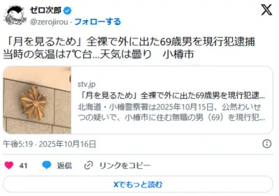 月を見るため全裸で外に出た男を現行犯逮捕 当時の気温は7.8℃