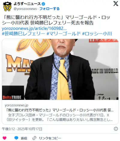 温泉清掃中にクマに襲われ死亡したのは女子プロレスのレフェリーだった笹崎勝巳さんであることが判明