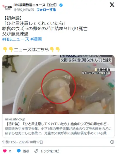 【初弁論】「ひと言注意してくれていたら息子はかんで食べていた」給食のウズラの卵をのどに詰まらせ小1死亡 父が意見陳述