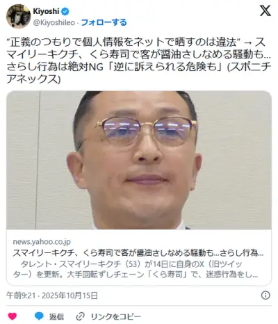 スマイリーキクチ、くら寿司で客が醤油さしなめる騒動 女性客に“私刑”を行うネット民に苦言「逆に訴えられる危険も」