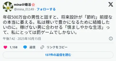 【悲報】婚活女子「年収500万の男と話すと将来設計が"節約"前提で萎える」