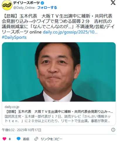 【悲報】玉木代表 TV生出演中に維新・共同代表会見割込み→小ワイプで見つめる屈辱2分 吉村氏の議員削減案に「なんでこんなのが…」