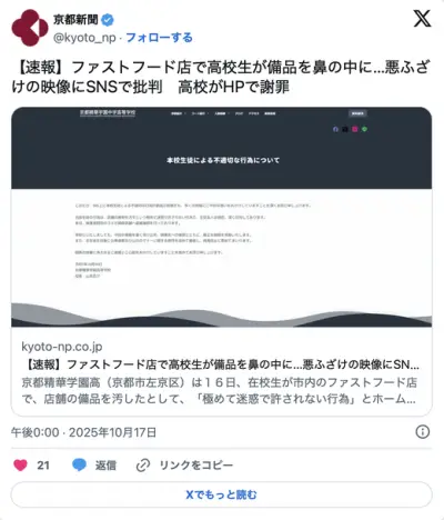 【京都】ファストフード店で男子高校生が備品を鼻の中に…悪ふざけの映像にSNSで批判 京都精華学園高校がHPで謝罪
