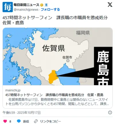 【佐賀鹿島】457時間ネットサーフィン、ニュースサイトのコメント書き込み 課長職の市職員を懲戒処分