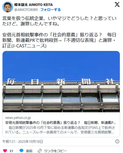 毎日新聞「安倍晋三氏への銃撃は社会的意義があった」→炎上して謝罪「テロ肯定ではない」