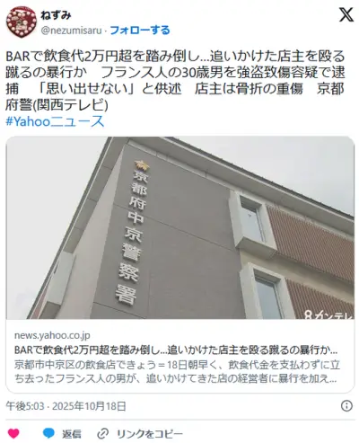 無銭飲食の男を追いかけた店主、ボコボコされ眼窩骨折の重傷・・・フランス国籍の男を強盗致傷容疑で逮捕