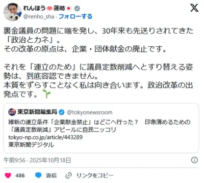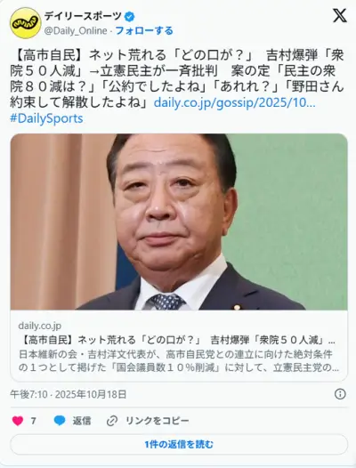 立憲野田『維新の議員定数削減は許しません!』→お前、民主党時代に議員定数削減しろと言ってたやん