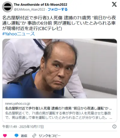 名古屋駅付近で歩行者3人死傷 逮捕の71歳男 “前日から夜通し運転”か 事故の6分前 男が運転していたとみられる車が現場付近を走行
