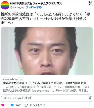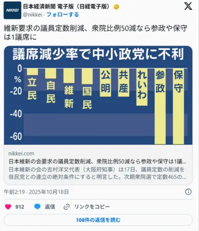 維新要求の「議員定数削減」で特にダメージを受ける政党は「公明党、共産党、れいわ、参政、保守」