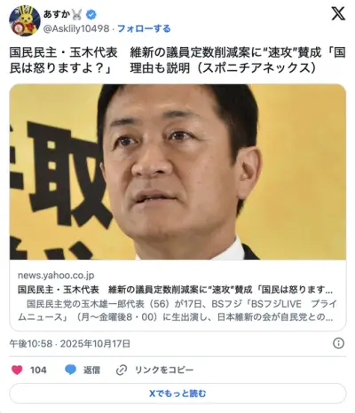 国民民主・玉木『自民&維新さん、議員数削減我々も協力するんで仲間に入れてもらえませんでしょうか』