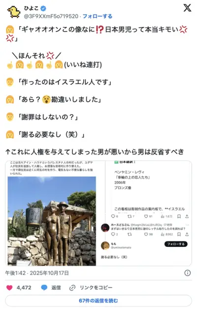 フェミ「この像なに??日本男って本当キモい」 →「それ作ったのイスラエル人」 →フェミ「謝る必要なし」