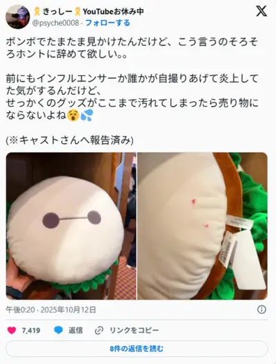ディズニーショップ、メイクで汚れたぬいぐるみ写真が波紋「買わないのに触るな。売り物にならない」ディズニー客マナーが炎上