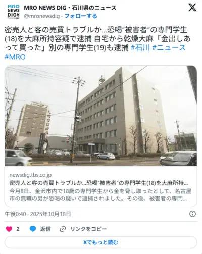 【石川金沢】大麻買おうとした学生の男(18)、売人に恐喝され警察に被害届を出し逮捕…無職の売人(21)も逮捕