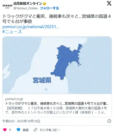 【(・(ェ)・)】トラックがクマと衝突、後続車も次々と…宮城県の国道4号で6台が事故