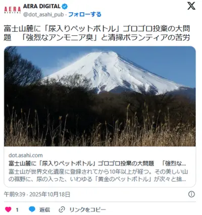 【黄金】富士山麓に「尿入りペットボトル」ゴロゴロ投棄の大問題 「強烈なアンモニア臭」と清掃ボランティアの苦労