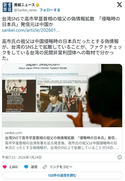 高市早苗首相祖父の偽情報が拡散 台湾SNS、中国発信元か