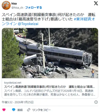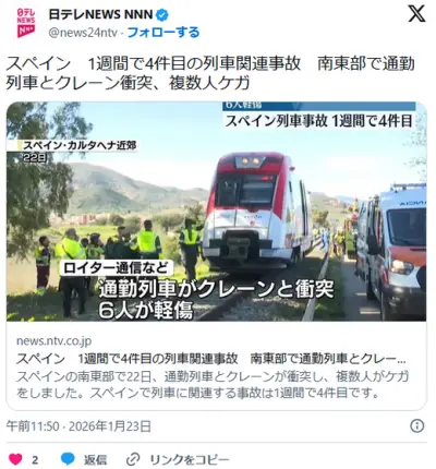 スペイン 1週間で4件目の列車関連事故 南東部で通勤列車とクレーン衝突、複数人ケガ