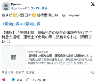JR福知山線 運転免許の条件の眼鏡をかけずに特急を運転 運転士が出発の際に装着を忘れる
