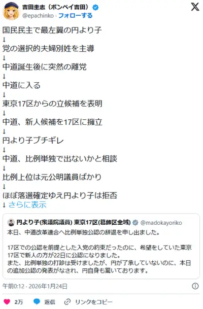 中道・円より子「話が違う。17区公認の約束なのに比例単独で公明の下じゃ当選しないじゃない