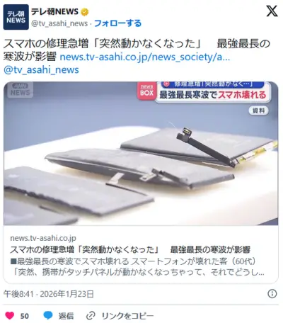 【📱】スマホの修理急増「突然動かなくなった」 最強最長の寒波が影響