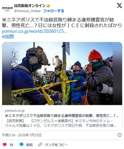 【米国】ミネソタ州ミネアポリスで不法移民取り締まる連邦捜査官が銃撃、男性死亡…7日には女性がICEに射殺されたばかり