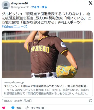 ダルビッシュ有「現時点で引退発表するつもりない」、地元紙引退報道を否定…残り3年契約放棄「傾いている」「細かな部分これから」