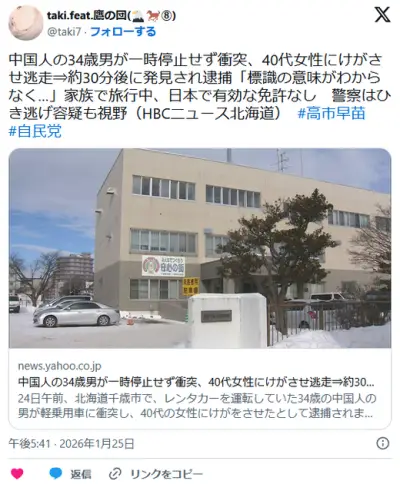 中国人の男が一時停止せず衝突、女性にけがさせ逃走⇒「標識の意味がわからなくて、交差点に入った」 日本で有効な免許なし 北海道
