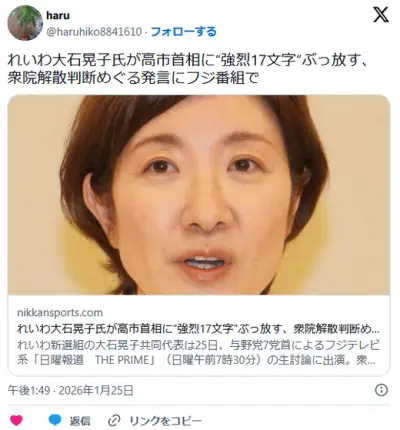 れいわ大石晃子氏が高市首相に「『早苗のわがまま解散』ですよ…」「面の皮の厚さマックスでしょう」 フジ番組で