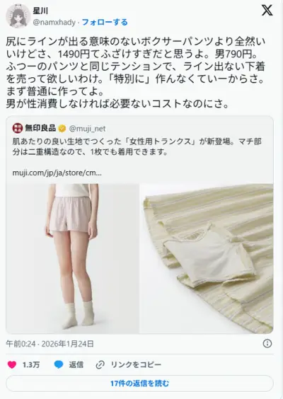 無印の女性用トランクスに女性様がブチギレ 性消費がどうのこうの