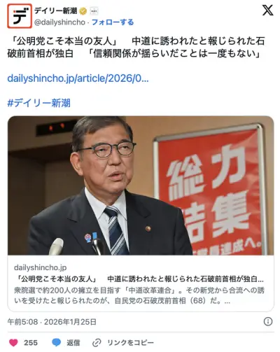 「公明党こそ本当の友人」 中道に誘われたと報じられた石破前首相が独白 「信頼関係が揺らいだことは一度もない」