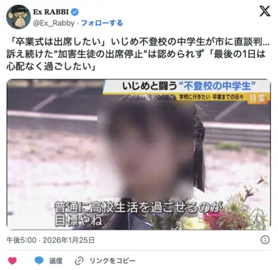 【いじめ】「卒業式は出席したい」いじめ不登校の中学生が市に直談判→加害生徒は別室で待機