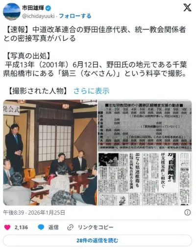 【速報】中革連の野田氏、統一教会関係者との密接写真がバレる