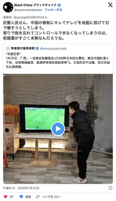 中国人さん、U23中国代表が日本に無様に負けまくってブチギレてテレビを壊す