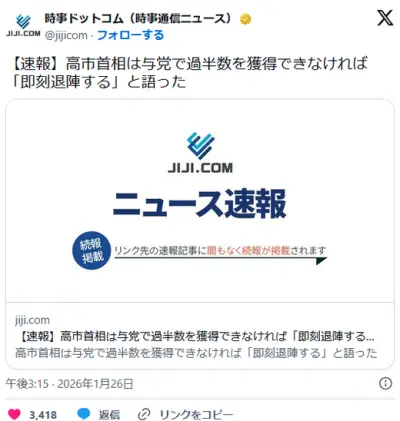 【速報】高市首相「与党で過半数を獲得できなければ即刻退陣する」