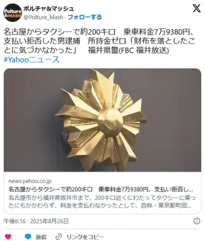 名古屋からタクシー 乗車料金7万9380円、支払い拒否した男逮捕「財布を落としたことに気づかなかった」
