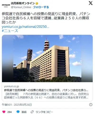 【デルパラ】参院選で自民候補への投票の見返りに現金約束、パチンコ会社社長ら6人を容疑で逮捕…従業員250人の買収図ったか