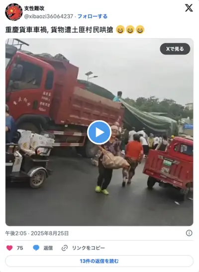 中国、重慶にてトラック事故が発生し商品が散乱。もちろん住民により略奪される