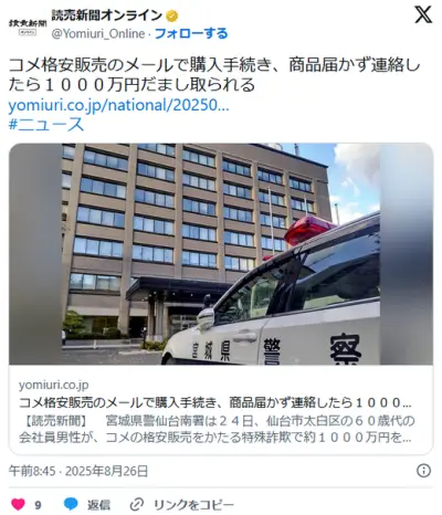 【コメ】コメ格安販売のメールで購入手続き、商品届かず連絡したら1000万円だまし取られる 宮城県仙台市の60代会社員男性