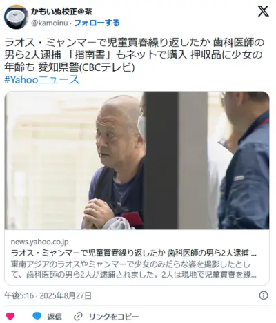 【速報】ラオス・ミャンマーで児童買春繰り返したか 歯科医師の男ら2人逮捕 「指南書」もネットで購入 愛知県警