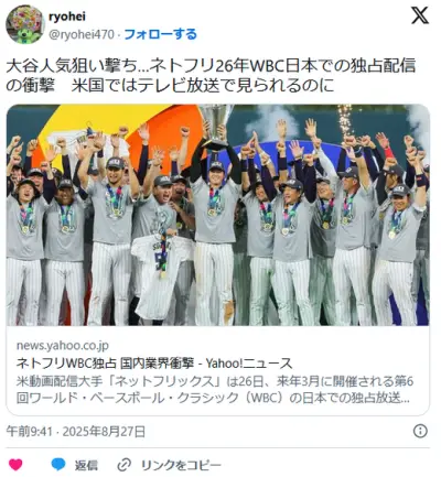【MLB】大谷人気狙い撃ち…ネトフリWBC独占配信 放映権料は30億→150億前後に高騰か 米国ではテレビで視聴可能