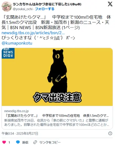 【新潟】「玄関あけたらクマ…」 中学校まで100mの住宅地 体長1.5mのクマ出没・加茂市