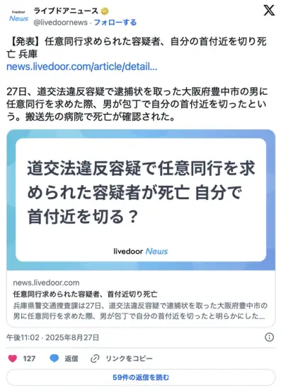 道交法違反の容疑で警察から任意同行を求められた男、包丁で自らの首を切って死亡