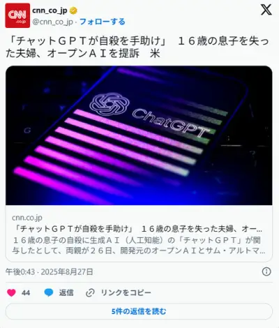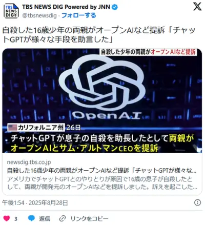 自殺した16歳少年の両親がオープンAIなど提訴「チャットGPTが様々な手段を助言した」