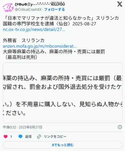 スリランカ人「日本がマリファナ違法だと知らなかった」なおスリランカでは所持で死刑も