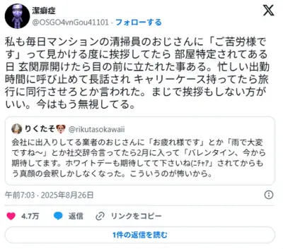【悲報】女さん「マンションの掃除員に挨拶したら勝手に好きになられた。もう二度と男には挨拶しない」