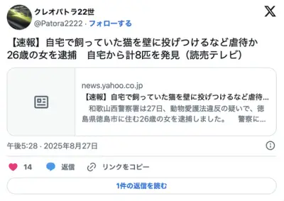 自宅で飼っていた猫を壁に投げつけるなど虐待か 26歳の女を逮捕 自宅から計8匹を発見 和歌山