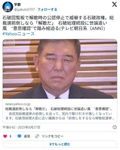 石破「私に逆らうなら解散だ。今解散したらお前らみんな落選だぞ。何せ党の顔が私だからな」